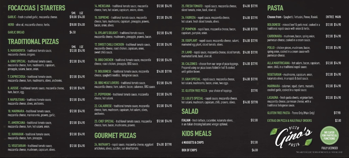 Welcome to Gino's Pizza and Pasta, a culinary gem located at 24 Poplar Ave, Shepparton. This vibrant restaurant serves a delightful array of dishes, catering to both pizza lovers and pasta enthusiasts. One of the key highlights is their commitment to quality, evident in their Gluten Free Pasta, which receives rave reviews for its taste and generous servings.